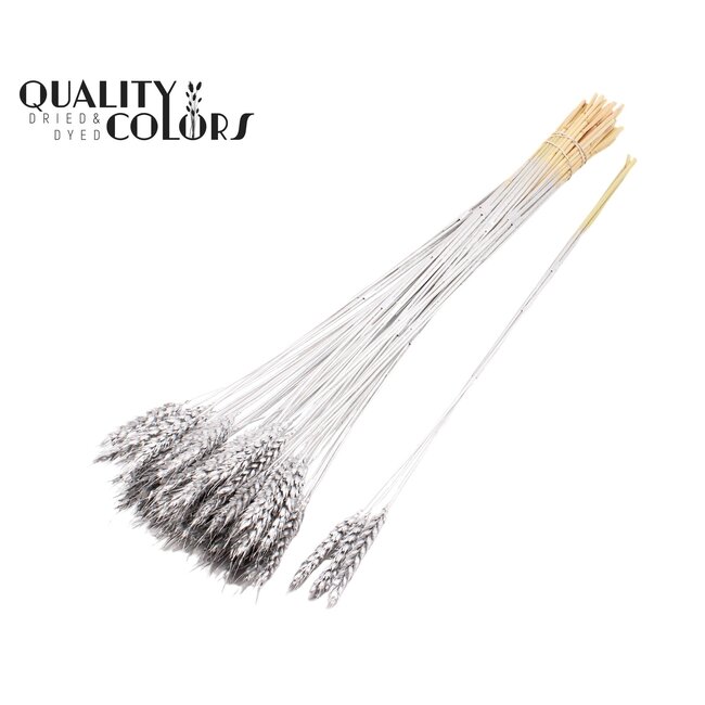 Getrockneter Weizen | Farbe: Silberfarben (Triticum) bietet eine elegante, langlebige Ergänzung für professionelle Blumenkreationen und Innenraumprojekte: robuste Halme mit einem raffinierten Metallton und einer Länge von ± 55 Zentimetern, ausgeführt mit 3 Büscheln pro Zweig und geliefert pro 25 Zweige. Diese silberfarbene Ausführung behält Textur und Form durch einen kontrollierten Trocknungsprozess, wodurch der Weizen außergewöhnlich geeignet ist für Floristen, Innenarchitekten und Eventplaner, die auf der Suche nach pflegeleichten, farbbeständigen Elementen für Saisonstücke, permanente Installationen und großflächige Eventstyling sind. Die natürliche Basis von Triticum kombiniert mit einer hochwertigen Beschichtung schafft ein luxuriöses, modernes Erscheinungsbild, das sich gut mit anderen Trockenblumen wie getrockneten Rosen, Mohn, Ginster, Ruscus und Helichrysum mischt, während das Produkt Konsistenz und langanhaltende Ästhetik garantiert.