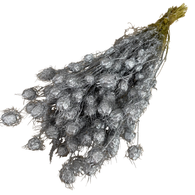 Entdecken Sie die raffinierte Schönheit der silberfarbenen Nigella Trockenblumen, eine exklusive Ergänzung des Sortiments von Dutch Dried. Diese getrockneten Blumen sind ein Inbegriff von Eleganz und Nachhaltigkeit, perfekt für Floristen und Innenarchitekten, die auf der Suche nach einzigartigen und langlebigen dekorativen Lösungen sind. Mit einer Länge von etwa 55 Zentimetern und einem Gewicht von circa 100 Gramm bieten diese Blumen eine auffällige metallische Ausstrahlung, die mühelos in verschiedene Blumenarrangements und Innenraumgestaltungen integriert werden kann.