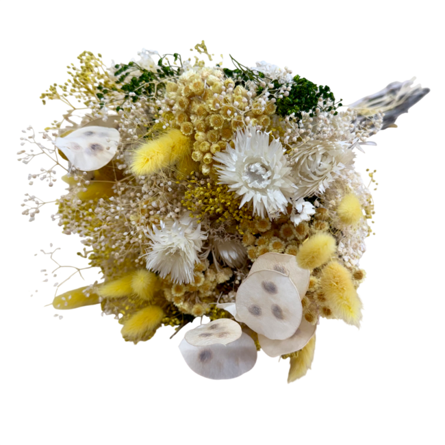 Mit einem vielseitigen Farbschema aus Gelb, Weiß und gemischten Farben ist dieser Strauß in verschiedenen Bestelleinheiten erhältlich, darunter pro Stück, pro 15 Stück und pro 5 Stück, was es einfach macht, den spezifischen Bedürfnissen Ihres Projekts gerecht zu werden. Die natürlichen Materialien und die sorgfältige Auswahl der Blumen sorgen dafür, dass dieser Strauß nicht nur visuell ansprechend, sondern auch von hoher Qualität ist. Ob Sie eine Veranstaltung planen oder ein Interieur verschönern möchten, die Trockenblumen von MyFlowers bieten eine zeitlose Eleganz, die jeden Raum bereichert.