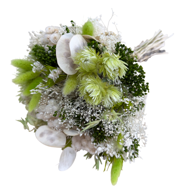 Der Trockenblumenstrauß Farfalla Bianco Verde von MyFlowers ist eine raffinierte Komposition aus weißen, weiß gebleichten und grünen Trockenblumen. Mit einer Länge von etwa 40 Zentimetern ist dieser Strauß eine perfekte Wahl für Floristen, Innenarchitekten und Eventplaner, die nach einer stilvollen und nachhaltigen Dekorationsoption suchen. Die natürlichen Materialien sorgen für ein authentisches Aussehen, das jeden Raum verschönern kann, während die Farbkombination aus Grün und Weiß eine moderne und frische Atmosphäre schafft.