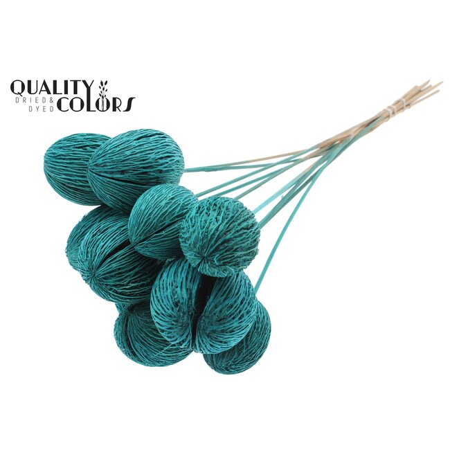 Product details and positioning: title as above; brand: QC; categories: Inserts, Dry Deco, Floristry Items, Home, Garden & Deco, Home & Hobby; product type: Floristry Items, Hobby Materials; colour schemes: Blue, Green, Other colours (turquoise shades); material: Natural (dried seed pods on stick); packaging information: 10 inserts per bunch, order unit per piece; professional applications: addition in bouquets and funeral work, decorative accents for hospitality and retail, sustainable event styling. This item combines aesthetic flexibility with ecologically responsible processing and is a perfect complement to other dried flowers and dry decorations such as dried roses, poppies, broom, ruscus, and Helichrysum within a commercial range.