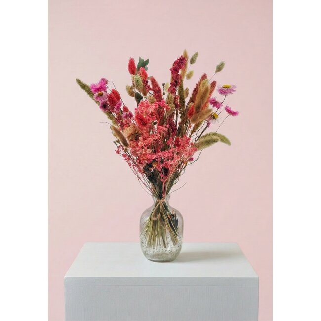 Dried Flower Bouquet "Cute Pink" (Colour: Mixed Colours | Length ± 50 centimeter | Per bouquet) is a carefully composed dried bouquet from the brand MyFlowers that stands for high quality and sustainable processing standards. This bouquet combines classics such as dried roses and Helichrysum with characterful accents such as poppy, broom (broom) and ruscus, making it a versatile choice for florists, interior designers and event planners who need long-lasting, low-maintenance and aesthetically consistent decorations. The natural materials are professionally dried to maximise colour retention and structural integrity, resulting in reliable, season-independent solutions for both retail and project applications.