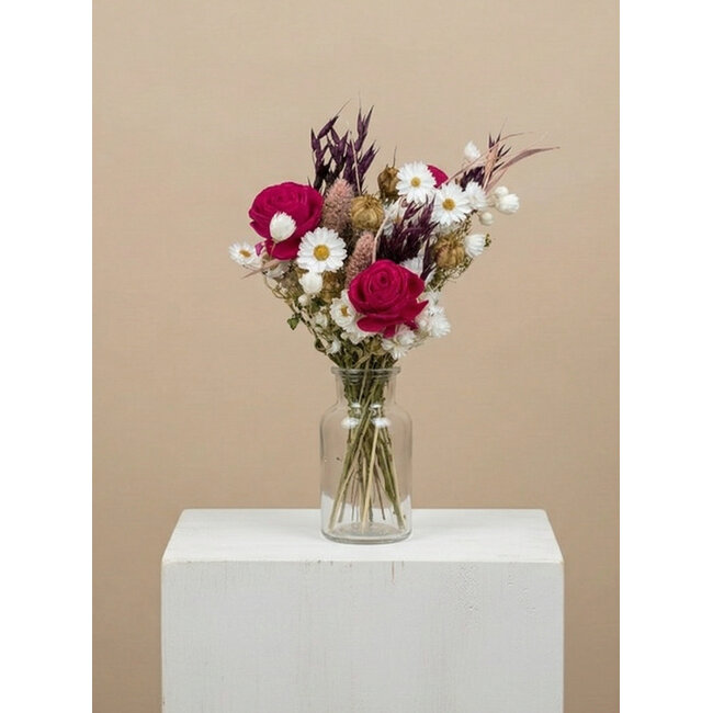 The Rosewood Pink Dried Flower Bouquet from MyFlowers is a refined composition of dried flowers, with dark pink artificial roses as the striking centrepiece. This bouquet, with a length of approximately 50 centimetres, stands out for its natural materials and mixed colours, making it a versatile choice for professional applications. It is ideal for florists, interior designers, and event planners seeking sustainable and aesthetically pleasing solutions for their projects.