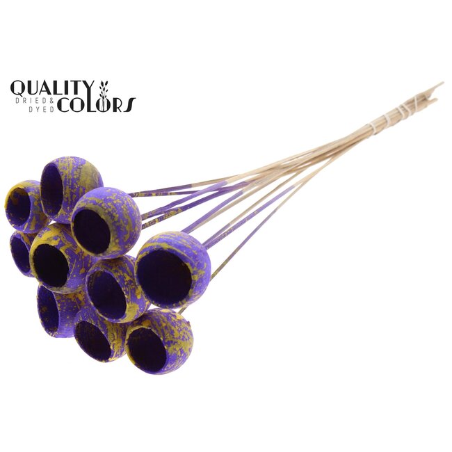 Dried Bellgums | Colour: Speckled Purple Yellow | Bell Cup Pick | Length ± 50 centimetres | 10 picks per bunch — this product from QC offers a distinctive mix of shaped, dried flower cups with a playful speckled colour scheme that adds subtle texture and long-lasting colour fastness to professional arrangements. By using natural materials and craftsmanship, the Bellgums retain their shape and appearance, making them extremely suitable for florists and event planners who need sustainable, low-maintenance decorations, as well as interior designers seeking long-lasting accents for hospitality and retail projects.