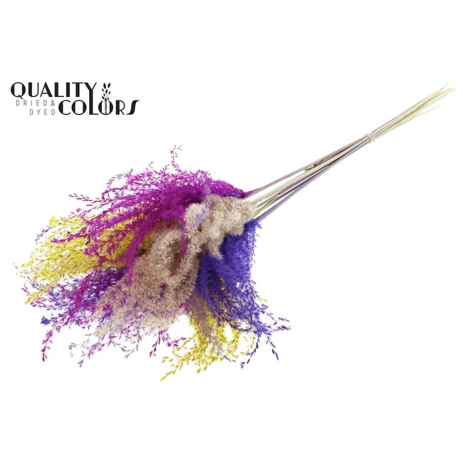 Product details: Title: Dried Chinese Silver Grass | Colourful 11 | Colour: Mixed Colours | Material: Natural | Length: ± 70 centimetres | Quantity: 5 stems per bunch | Packaging: Per bunch. Categories: Floristry Items, Grains and Grasses, Branches and Plumes. Order unit: Per piece. Applications: seasonal decorations, sustainable event styling, permanent interior arrangements, photo sets and retail presentations. USPs: high colour stability, long lifespan, sustainably grown and dried with minimal environmental impact, consistent quality for large-scale projects and repeat orders. This product supports professional applications where reliability, aesthetics, and sustainability at a B2B level are crucial.