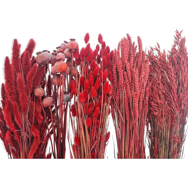 Product details: Product category: Dried Flowers; Colour: Red; Order unit: Per piece, Per 5 pieces; Material: Natural; Brand: Dried Concepts. Features: high-quality drying process for optimal colour retention, uniform selection for consistent business presentation, low maintenance requirement and excellent suitability for long-term indoor installations. Related products and complementary varieties within our range: dried roses, poppy, broom, ruscus, and Helichrysum — ideal for mixed bouquets, hospitality and retail styling, seasonal concepts, and large-scale event decorations. Sustainability and quality are central: responsible sourcing, minimal water requirement, and long lifespan make this set economically attractive for professionals seeking reliable, sustainable materials for their projects.