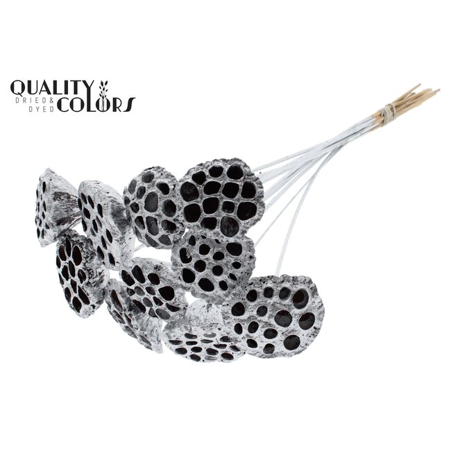 Dried Lotus Pods on a stick (silver-coloured) from QC are robust, aesthetic picks that combine natural texture with a refined metallic finish, specially developed for professional applications. These dried lotus pods retain their shape and colour through careful drying methods and post-processing, making them extremely suitable for florists, interior designers, and event planners who need durable, low-maintenance, and visually strong elements for arrangements, compositions, and decorative installations. The silver-coloured coating offers a modern, upscale look without compromising the natural structure of the product, making them ideal for high-end hospitality and retail projects, seasonal and statement decorations, and long-term stock in florists.