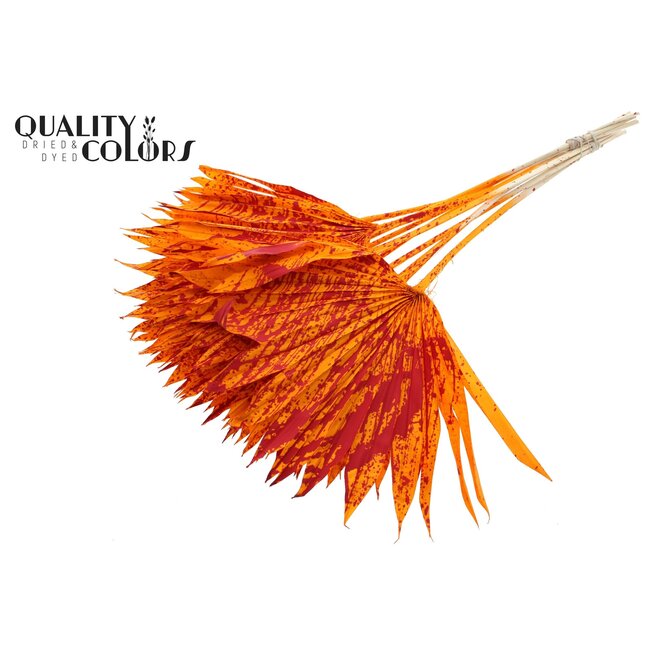 Dried Palm Sun Spear | Colour: Speckled Orange Red | Fan-shaped Palm Leaves | Length ± 50 centimetres | 10 stems per bunch | Each bunch is a striking, high-quality addition to professional assortment lines and showpieces. These fan-shaped palm leaves, in a speckled orange-red hue, are sourced from QC and have been carefully dried to retain colour intensity and structural integrity; making them particularly suitable for florists, interior designers, and event planners seeking sustainable, low-maintenance, and visually impactful elements for arrangements, walls, and seasonal decorations. As a natural material, they combine excellently with other dried flower types for texture and depth, such as dried roses, poppies, broom, ruscus, and Helichrysum, offering a cost-effective alternative to fresh materials without compromising on aesthetics or longevity.