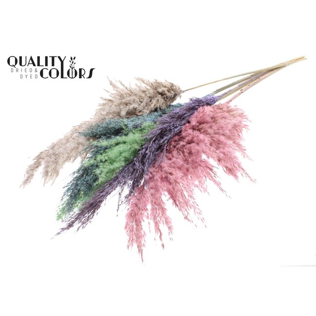 The QC dried pampas plumes in mixed colours are an excellent choice for florists, interior designers, and event planners looking for versatile and sustainable decorative solutions. With a length of approximately 100 centimetres and five plumes per bunch, these pampas plumes offer a striking aesthetic that can transform any space. Their natural material and vibrant colours make them ideal for creating dynamic floral arrangements and unique interior accents.