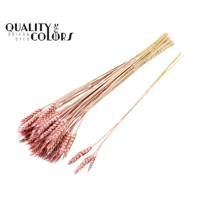 Dried Wheat | Colour: Frosted Pink | Triticum — length ±55 cm, 3 tufts per stem, per 25 stems. This dried wheat from QC is selected and dried while preserving shape and colour, ensuring each bundle delivers consistent quality and long-lasting aesthetics for professional applications. Thanks to the natural material and the subtle Frosted Pink hue, this Triticum works excellently in florist bouquets, permanent interior styling, and large-scale event decorations where low-maintenance, shape-retaining, and colour-fast elements are required.