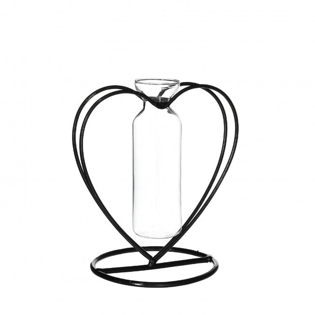 Heart Frame with Glass Tube Vase | Colour: Black | Length 10 centimeter | Width 10.5 centimeter | Diameter tube vase 2 centimeter | Per 6 hearts — this compact, high-quality black heart frame of glass combines clean design with functional flexibility and is designed for professional use by florists, interior designers and event planners. The subtle tube vase is ideal for dried flowers and silk flowers such as dried roses, Helichrysum, ruscus and poppy, making it perfect for themes around Mother's Day, Weddings and Valentine's, as well as for permanent styling in Home, Garden & Deco and Pots & Vases. The design supports sustainable furnishing concepts: reusable glass, low-maintenance use with dried and artificial flowers, and consistent quality that withstands long exhibitions and events.
