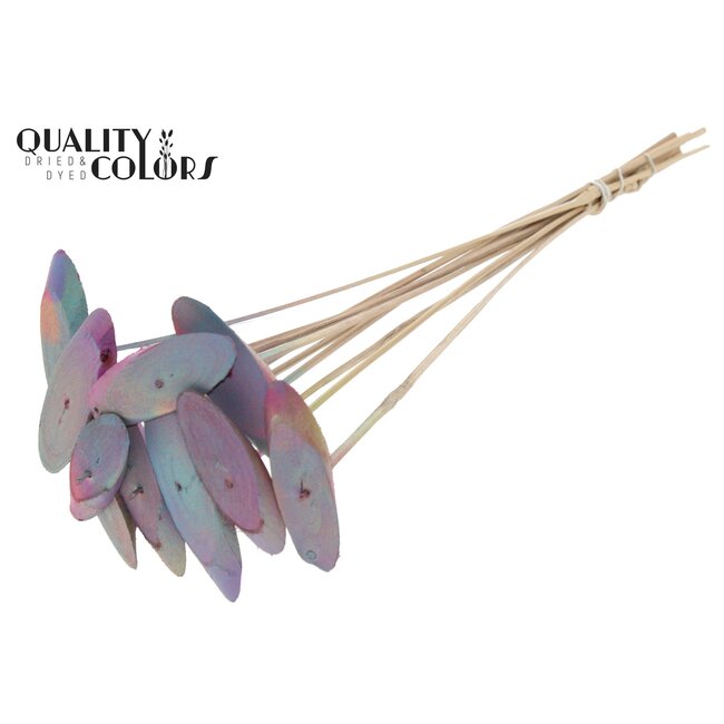 The Oval Wooden Disc on Stick from QC is a high-quality, natural pick designed for professional florists and decorators. These picks feature a soft gradient in pink and are crafted as oval wooden discs on sticks, supplied in bunches (10 picks per bunch). With a carefully finished wood texture and consistent dimensions (diameter 5 - 7 centimetres, length ± 50 centimetres), they offer both aesthetic value and structural stability in dried flower and interior arrangements. Applications include floral arrangements, dry deco, shop displays, and event styling, where the natural appearance seamlessly fits modern and rustic concepts.