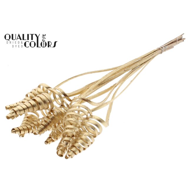 Palm Spiral on stem in antique gold colour is a functional and aesthetic cane cone pick specifically developed for professional florists and interior stylists. The spiral-shaped palm head on a sturdy stem combines natural material choice with a refined metallic finish, making this pick ideal for tall installations, creative floral arrangements, and sustainable dried flower compositions. This pick, with a length of approximately 50 centimetres, delivers consistent results in event styling, shop displays, and seasonal decorations and meets the high-quality standards of B2B Flowers BV and the QC brand.