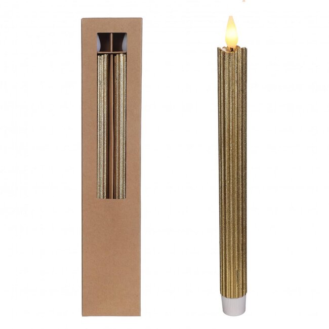 The Pencil Candle LED from 4A is a slim, gold-coloured LED candle designed for professional applications within Candles and Home, Garden & Deco in the Home & Hobby category. This model is supplied per 2 pieces (order unit: per 2 pieces) and has a narrow diameter of 2,1 cm and a height of 25 cm; AAA batteries are not included. Categorised under Floristry Items and Occasion Items, the candle is made from other materials with metallic-coloured and yellow accents for a refined, durable aesthetic that blends seamlessly with both dried flowers and silk flowers and other decorative elements.