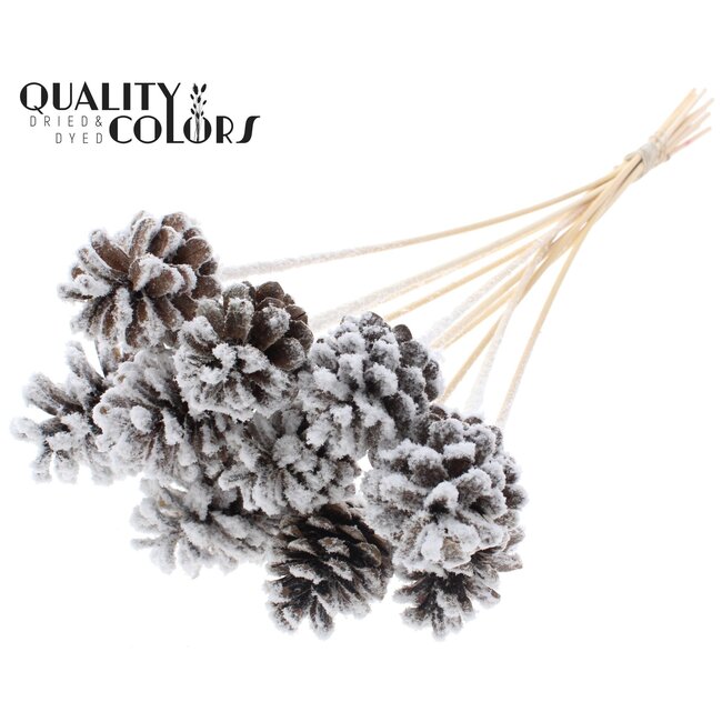 Pine cone on stick | Colour: Natural with Snow | Diameter 5 - 7 centimetres | Length ± 50 centimetres | 10 picks per bunch is a carefully selected and hand-finished decorative product that provides professional florists, interior designers, and event planners with a natural, rustic accent. These pine cones on sticks combine a realistic appearance with a light snow finish, making them ideal for seasonal displays, wreaths, table decorations, and themed floral arrangements. Selected for quality and durability, the pine cones from the brand QC come from responsible sources and are intended for long-term use in commercial applications where consistent appearance and material integrity are essential.