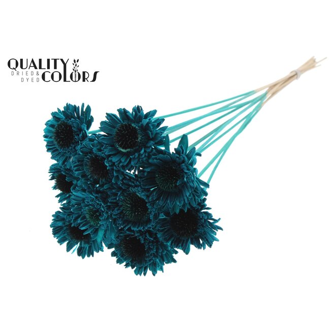 Shola Daisy Sunflower on stem | Colour: Turquoise — a carefully crafted Shola Daisy Sunflower that combines design and sustainability for professional applications. This artificial flower is made from natural shola material with a realistic texture and colourfastness, making it highly suitable for arrangements, window decorations and event styling where consistency and reusability are essential. With a diameter of 6 centimeter and a length of circa 50 centimeter this product delivers reliable dimensions and finish that enables florists, interior designers and event planners to achieve uniform, low-maintenance displays without compromising on aesthetics or a high-quality appearance.