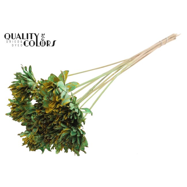 Shola Flower on stem in the colour splattered mint green yellow is a high-quality, natural decorative element from the Shola Slice Pine collection that offers professionals versatile design possibilities. This Shola slice has a diameter of 6 centimeter and a length of ±50 centimeter, and is supplied per bunch with 10 picks—an ideal choice for florists, interior designers and event planners looking for low-maintenance, consistent and aesthetically strong accents for arrangements, installations and lighting- or table-decorations. Made from natural shola material this product offers the look of handcrafted finesse with the durability and colour stability required for commercial applications; available from the quality brand QC.