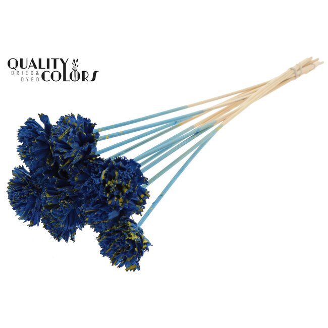 Details: Shola Flowers, Artificial Flowers, Karnish Flower; Product category: Floristry Articles, Artificial Flowers; Order unit: Per piece; Material: Natural (Shola); Colour: Mixed colours—splattered blue and yellow; Diameter: 6 centimeter; Length: ± 50 centimeter; Package contents: 10 picks per bunch; Sales unit: Per bunch. QC applies strict quality controls for colour consistency and finish, making these Karnish variants ideal for professional projects that require reliability, aesthetic finesse and a sustainable choice.