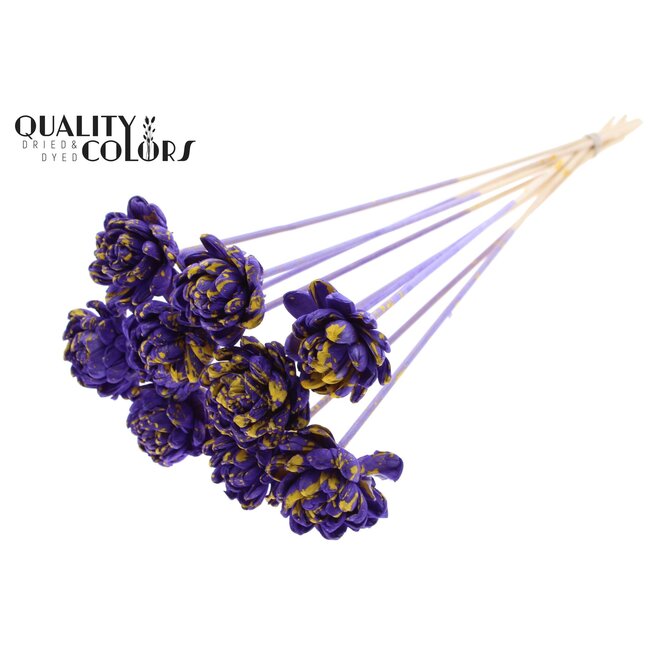 Shola rose on stem | Colour: Spattered Purple Yellow | Shola New Beauty Rose | Diameter 6 centimetre | Length ± 50 centimetre | 10 picks per bunch | Per bunch is a high-quality, artisanal artificial flower based on natural shola material, executed in a striking spattered purple-yellow tint. This New Beauty Rose combines realistic texture and refined colour accents with low-maintenance use, making it highly suitable for florists, interior designers and event planners seeking durable, consistent and colour-fast solutions for long-term installations, shop displays and themed events. Thanks to the delivery per bunch with 10 picks the product offers efficiency and uniform quality for large-scale applications.