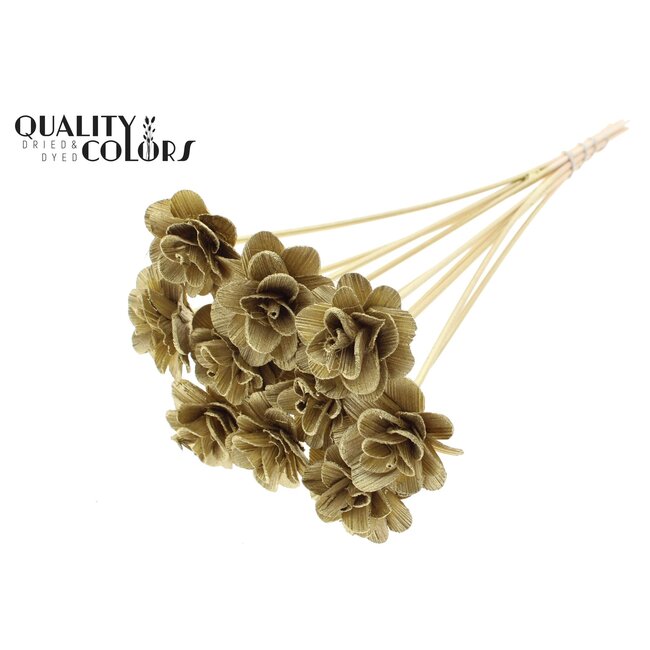 Product details and specifications: Shola Wooden Rose on a stick | Shola Beetal Rose Pick — Colour: gold (also available in yellow, metallic colours, and other colours) — Rose diameter: 6 centimetres — Pick length: ± 50 centimetres — Packaging: 10 picks per bunch (order unit: per piece) — Material: natural shola (sustainable, lightweight) — Categories: Shola Flowers, Artificial Flowers, Floristry Items. Additional selling points for professionals: consistent colour finish for events, tear resistance during processing, long shelf life without care, and excellent compatibility with other floristic materials for B2B collections and seasonal assortment building.