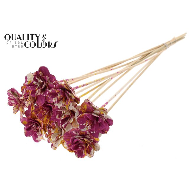 Shola Wooden Rose on a Stick | Colour: Multicoloured (cherry-coloured, yellow) — Shola Beetal Rose Pick is a handcrafted, natural shola flower on a sturdy stick, specially developed for professional applications. This pick combines the realistic appearance of natural materials with the practical benefits of artificial flowers: maintenance-free, colourfast, and suitable for long-term displays. With a compact rose diameter of 6 centimetres and a pick length of approximately 50 centimetres, this product offers consistency and reliability for florists, interior designers, and event planners who need high-quality, durable accents in bridal work, boutonnieres, displays, and corporate installations.