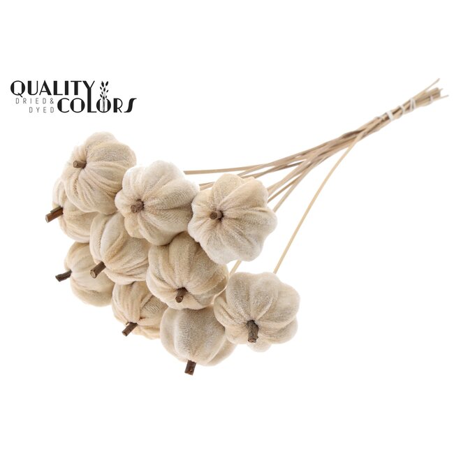 Velvet Pumpkin on a Stick | Colour: Natural White: a refined, professionally finished pick that combines luxurious texture with practical durability. This velvet pumpkin on a natural stick is designed for use in floral arrangements, seasonal decorations, and thematic installations, offering consistency and high-quality finish for florists, interior designers, and event planners. The soft velvet retains colour and appearance, while the natural stick provides sturdiness and an authentic, artisanal look — suitable for floral arrangements, table decorations, wreaths, and large-scale Halloween setups where reuse and longevity are important. As a product of QC, it meets professional quality standards and aligns with sustainable sourcing strategies as it is reusable and low-maintenance compared to fresh decorative elements.