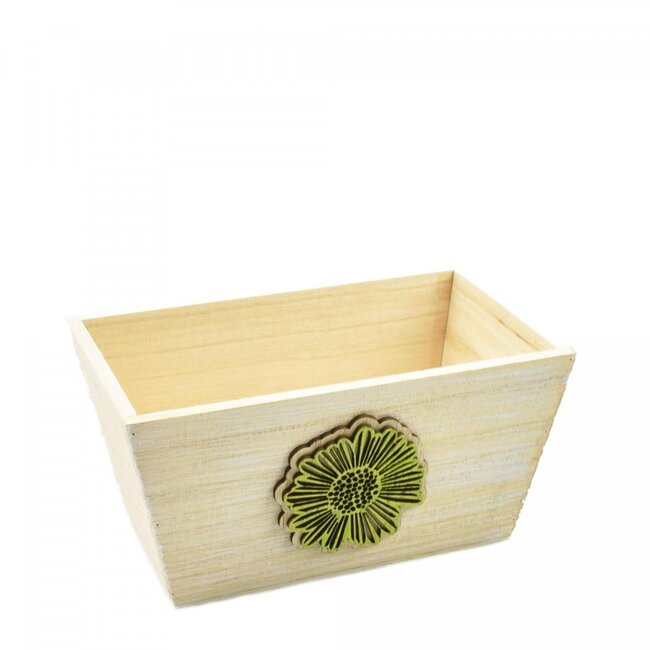 Product details and specifications: Title: Wooden Flowerpot Planter “Dona Flower” | Colour: Apple green; Dimensions: Length 19 cm × Width 11 cm × Height 10 cm; Material: Wood; Order unit: Per 6 pieces; Filters/categories: Decoration, Floristry Items; Colour filter: Green; Size class: Height/Length 11 - 20 centimetres, Diameter/Pot size 11 - 20 centimetres. Category placement: Home, Garden & Deco / Home & Hobby / Pots & Vases. Unique selling points: high-quality wood finish and colourfastness for consistent projects, sustainable material choice with long lifespan, suitable for combination with dried and silk flowers and developed for efficient commercial purchasing and large-scale application in floristry and event styling. These pots support professional workflows through uniform sizing and a representative, durable appearance for customer and project presentations.