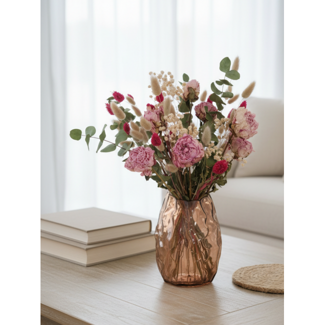 Het Boeket droogbloemen Zara van MyFlowers is een zorgvuldig samengesteld, duurzaam droogboeket dat direct inzetbaar is voor commerciële toepassingen. Centraal staan natuurlijke materialen zoals eucalyptus en roze pioenrozen, aangevuld met karaktervolle droogbloemen zoals Helichrysum, gedroogde rozen, papaver, broom en ruscus, die samen zorgen voor diepte, textuur en kleurvastheid. Dit product is ontworpen voor professionals die langdurige, onderhoudsarme bloemoplossingen nodig hebben: bloemisten vinden het geschikt voor seizoenscollecties en bruidswerk, interieurontwerpers gebruiken het voor hotels, kantoren en retailpresentaties, en event planners profiteren van de consistente kwaliteit en betrouwbaarheid bij grootschalige inzet.