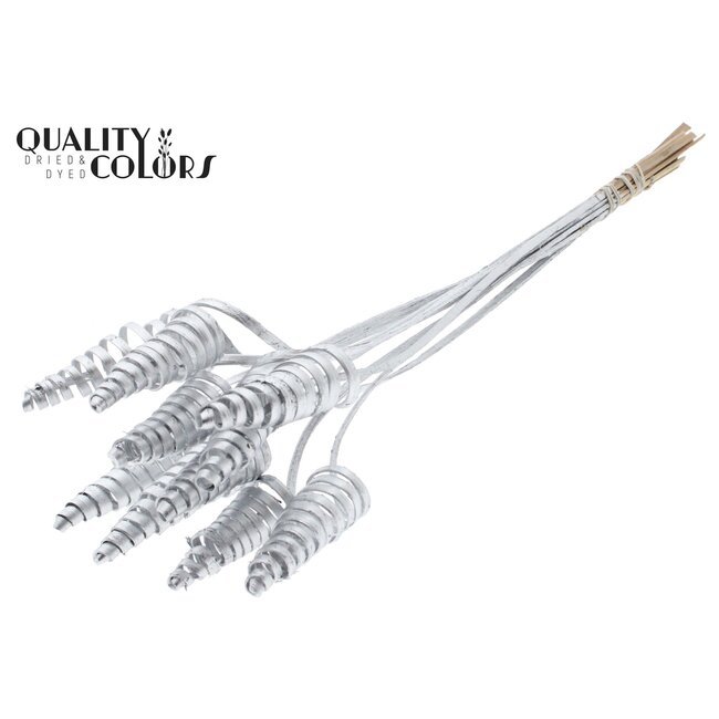 Palm Spiraal op steel | Kleur: Zilverkleurig | Cane Cone Bijsteker | Lengte bijsteker ± 50 centimeter | Per 10 bijstekers is een professioneel ontworpen bijsteker voor het stabiel en esthetisch presenteren van Arecaceae (palmen) en andere droogbloemarrangementen. De Cane Cone constructie gecombineerd met een spiralensteel biedt optimale houvast voor gedroogde palmbladeren en zware bloemstukken, terwijl de zilverkleurige, metaalkleurige afwerking een neutrale, luxueuze uitstraling geeft die goed samengaat met diverse interieur- en eventconcepten. Dit product is vervaardigd uit natuurlijke materialen volgens hoge kwaliteitsnormen van het merk QC, wat resulteert in duurzame, onderhoudsarme bijstekers die geschikt zijn voor bloemisten, interieurontwerpers en eventplanners die betrouwbare en langdurige oplossingen zoeken voor commerciële toepassingen.