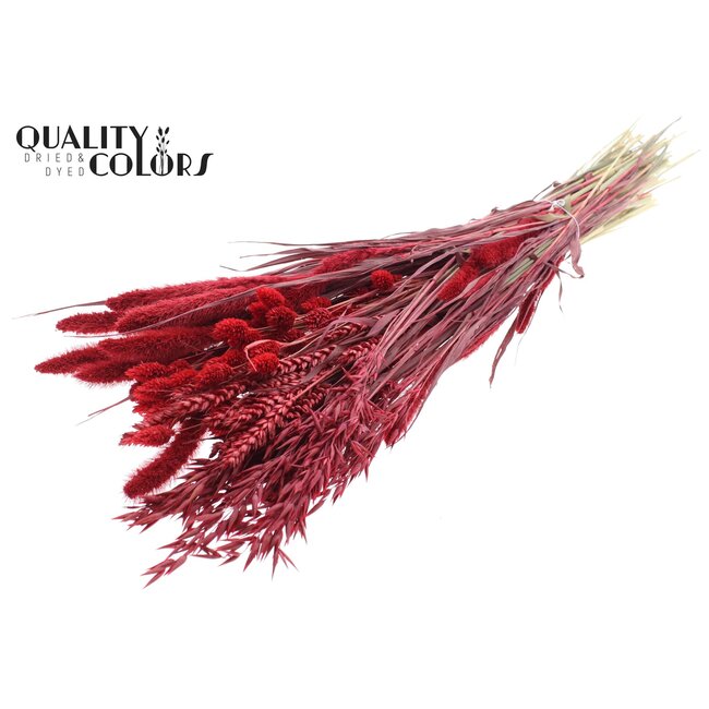 Boeket Gedroogde Bloemenmix | Kleur: Rood | Lengte ± 60 centimeter | Per bos is een zorgvuldig samengestelde mix van hoogwaardige droogbloemen, waaronder gedroogde rozen, papaver, brem, ruscus en Helichrysum (strobloem). Dit boeket, geleverd per bos en uitgevoerd in een diepe rode tint, is vervaardigd van natuurlijke materialen en biedt bloemisten, interieurontwerpers en event planners een onderhoudsarme, kleurvaste en langdurige oplossing voor bloemstukken, retailpresentaties en seizoensgebonden installaties. De mix is geselecteerd en gesorteerd volgens professionele kwaliteitsnormen van QC, waarbij vormbehoud en kleurintensiteit centraal staan voor consistente resultaten in commerciële toepassingen.