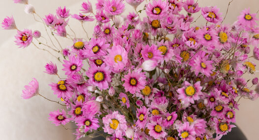 Rhodanthe, ook wel bekend als de 'Sonnenglanz', is geliefd om haar papierachtige bloemetjes die nooit lijken te verwelken. Deze vrolijke roze en witte bloemen brengen direct een zomerse, romantische sfeer in uw bloemcreaties of interieurprojecten.
