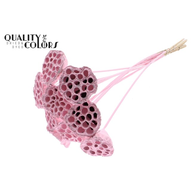 De gedroogde Lotus peulen op stok van QC presenteren zich als een verfijnde, natuurlijke decoratieve component met een subtiele frosted lichtroze tint en een bloemdiameter van 5–7 cm. Elke bos bevat 10 bijstekers op een bijstekerlengte van circa 50 cm, waardoor ze uitermate geschikt zijn als structureel element in grotere bloemstukken en arrangementen. Het materiaal is volledig natuurlijk en zorgvuldig gedroogd om vorm en textuur te behouden, wat zorgt voor een consistente uitstraling en lange levensduur in presentaties voor bloemisten, interieurontwerpers en event planners.