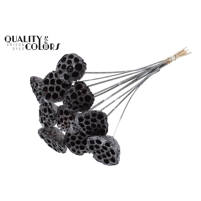 Gedroogde Lotus Peulen op stok | Kleur: Grafiet Grijs Metallic | Diameter Lotus 5 - 7 centimeter | Lengte bijsteker ± 50 centimeter | 10 bijstekers per bos is een zorgvuldig geselecteerd droogproduct van QC dat zakelijke bloemisten, interieurontwerpers en eventplanners voorziet van een robuuste, esthetische blikvanger. De natuurlijke lotuspeulen zijn professioneel gedroogd en afgewerkt met een subtiele grafiet grijs metallic tint die kleurvast en lichtreflecterend blijft onder intensief gebruik, waardoor ze uitermate geschikt zijn voor langdurige presentaties, seizoensdecoraties en high-end projecten waar onderhoudsarme duurzaamheid en een consistent beeld cruciaal zijn.