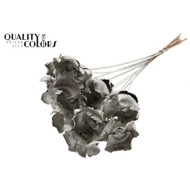 Gedroogde Palm Cup op steel | Kleur: Platinakleurig | Lengte ± 50 centimeter | 10 stelen per bos — deze platinakleurige palmcup op steel combineert natuurlijke structuur met een duurzaam, decoratief metalen finish, waardoor hij uitermate geschikt is voor zakelijke bloemisten, interieurontwerpers en eventplanners die op zoek zijn naar onderhoudsarme, langdurige accenten. De stevige steel en zorgvuldig gedroogde palmcup behouden vorm en kleur, waardoor dit product ideaal is voor grote installaties, droogboeketten, tafeldecoraties en thematische events waar consistentie en kwaliteit essentieel zijn. Als aanvulling op uw assortiment droogbloemen werkt deze palmcup bijzonder goed naast populaire droogbloemen zoals gedroogde rozen, papaver, brem, ruscus en Helichrysum, waardoor veelzijdige combinaties mogelijk zijn zonder concessies aan duurzaamheid of uitstraling.