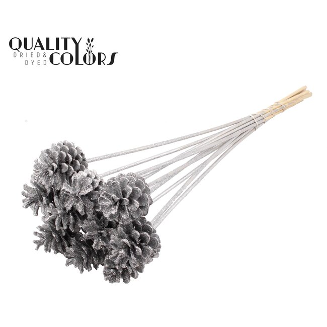 Pine cone 5-7cm on stem Silver + Glitter