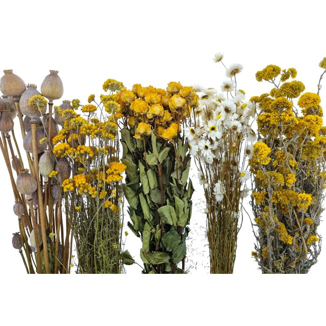 De Droogbloemen DIY set "La Graciosa" van Dried Concepts is een zorgvuldig samengestelde collectie gele gedroogde bloemen, speciaal ontwikkeld voor professionele eindgebruikers zoals bloemisten, interieurontwerpers en eventplanners. Deze set biedt een consistente kleurtoon en textuur die uitstekend combineert met andere droogbloemsoorten zoals gedroogde rozen, papaver, broom (broomtakken), ruscus en Helichrysum, waardoor hij geschikt is voor duurzame boeketten, seizoensdecoraties en langdurige installaties in commerciële omgevingen.