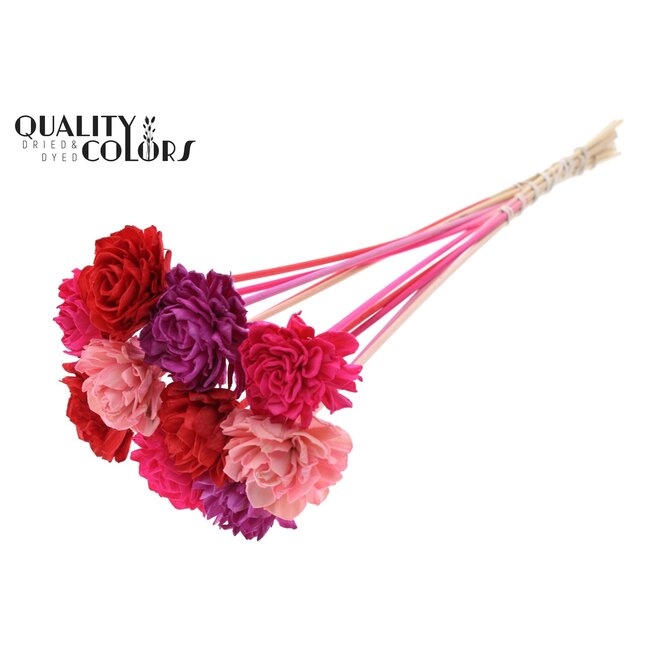 Shola Houten Dahlia op stok | Kleur: Gemengde Kleuren Liefdesmix — een verfijnde, natuurlijke Shola dahlia op steel met een bloemdiameter van 6 centimeter en een totale lengte van circa 50 centimeter, geleverd als set van 10 bijstekers per bos. Deze Shola Dahlia Bijsteker van het merk QC combineert de warme, matte uitstraling van natuurlijk shola-materiaal met consistente afmetingen en levendige, gemengde kleuren, waardoor ze uitermate geschikt is voor bloemisten, interieurontwerpers en event planners die duurzame, onderhoudsarme en esthetisch duurzame oplossingen zoeken voor installaties, hotel- en retailstyling, en bruidswerk. De lichte, natuurlijke structuur van shola maakt nauwkeurige verwerking mogelijk en zorgt voor langdurige kleurstabiliteit zonder water of verzorging.