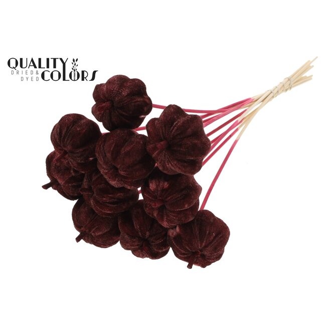 Fluwelen Pompoen op stok | Kleur: Bordeauxrood | Pompoen Bijsteker | Diameter pompoen 6 centimeter | Lengte ± 50 centimeter | 10 bijstekers per bos is een hoogwaardige, stijlvolle decoratieve bijsteker die speciaal is ontwikkeld voor zakelijke toepassingen in bloemisterij en seizoensdecoratie. De zachte, fluwelen afwerking combineert een luxe uitstraling met robuuste gebruikseigenschappen, waardoor deze bijsteker zich uitstekend leent voor floristen, interieurontwerpers en event planners die duurzame en esthetisch consistente oplossingen zoeken voor herfst- en Halloween-arrangementen. Gemaakt met aandacht voor kwaliteit en duurzaamheid onder het merk QC, biedt deze pompoen een realistische textuur en kleurvastheid die langdurige presentaties en hernieuwde inzetbaarheid mogelijk maakt.