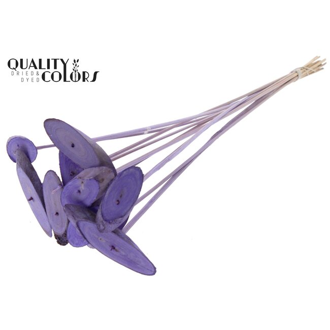Ovalen Houtschijf op stok | Kleur: Frosted Milkapaars | Houtschijf Bijsteker | Diameter 5 - 7 centimeter | Lengte ± 50 centimeter | 10 bijstekers per bos | Per bos is een professioneel afgewerkte bijsteker van natuurlijk hout met een subtiele frosted milkapaars afwerking die zich leent voor hoogwaardige bloem- en decoratiesamenstellingen. De ovale houtschijf op stok biedt een consistente, duurzame basis voor droogdeco en bloemisterijprojecten en is speciaal ontworpen voor gebruik door bloemisten, interieurontwerpers en event planners die op zoek zijn naar onderhoudsvrije, esthetische accenten. Door het natuurlijke materiaal en de verfijnde afwerking is dit product geschikt voor seizoensgebonden arrangementen, retailpresentaties en langdurige interieurtoepassingen waarbij kleurvastheid en robuustheid vereist zijn.