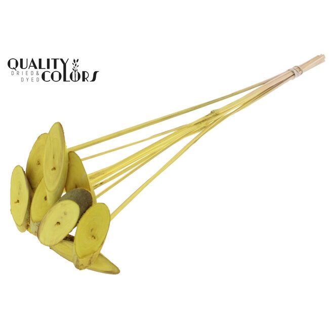 Specificaties en toepassing: Titel: Ovalen Houtschijf op stok | Kleur: Geel | Houtschijf Bijsteker; Diameter: 5–7 centimeter; Lengte: ± 50 centimeter; Verpakking: 10 bijstekers per bos (Per bos); Materiaal: Natuurlijk hout; Kleur: Geel; Bestemd voor categorieën: Bijstekers, Bloemisterijartikelen, Droogdeco, Huis, Tuin & Deco, Huis & Hobby; Productcategorieën/filters: Bloemisterij Artikelen, Hobbymaterialen. Toepassingen omvatten gebruik als structureel element in bloemstukken met gedroogde rozen, papaver, broom, ruscus en Helichrysum, basis voor zijdebloemen en duurzame decoratie in evenementen en retailomgevingen; door de natuurlijke materiaalkeuze en consistente afwerking ondersteunt dit product duurzame inkoopbeleid en vormt het een betrouwbaar onderdeel van professionele voorraad. Geschikt voor professionals die hoge kwaliteit en langetermijnwaarde verwachten zonder concessies te doen aan esthetiek en duurzaamheid.